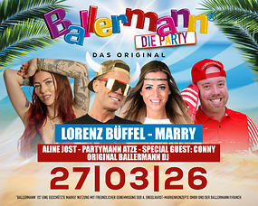 Ballermann - die Party - das Original kommt nach Vacha/Thüringen, ins legendäre Vachwerk, direkt an die Grenze zu Hessen! Mit dabei, einer der Superstars des Megaparks - LORENZ BÜFFEL! Gemeinsam mit Marry, Partymann Atze, Aline Jost und einem Original Ballermann DJ, wird er das Vachwerk zum Beben bringen!